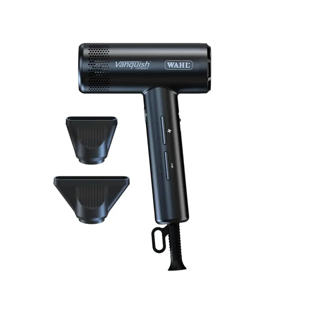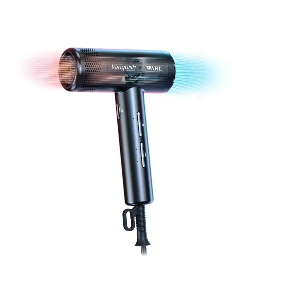 💨 Erő és elegancia kompakt formában! A Wahl Vanquish® Compact új szintre emeli a hajszárítást: digitális motorral, csendes működéssel, iontechnológiával és extra könnyű kialakítással tökéletes társ a mindennapi professzionális munkához.